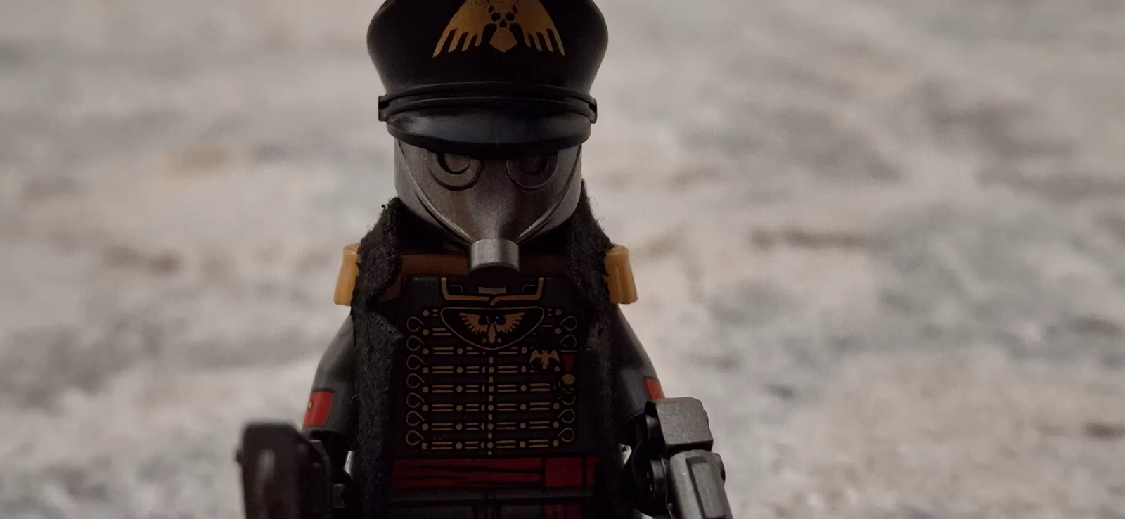 Death Korps of Krieg Commissar figurine. Fits Lego block bases. Highly detailed. Comes with pistol and chain sword.